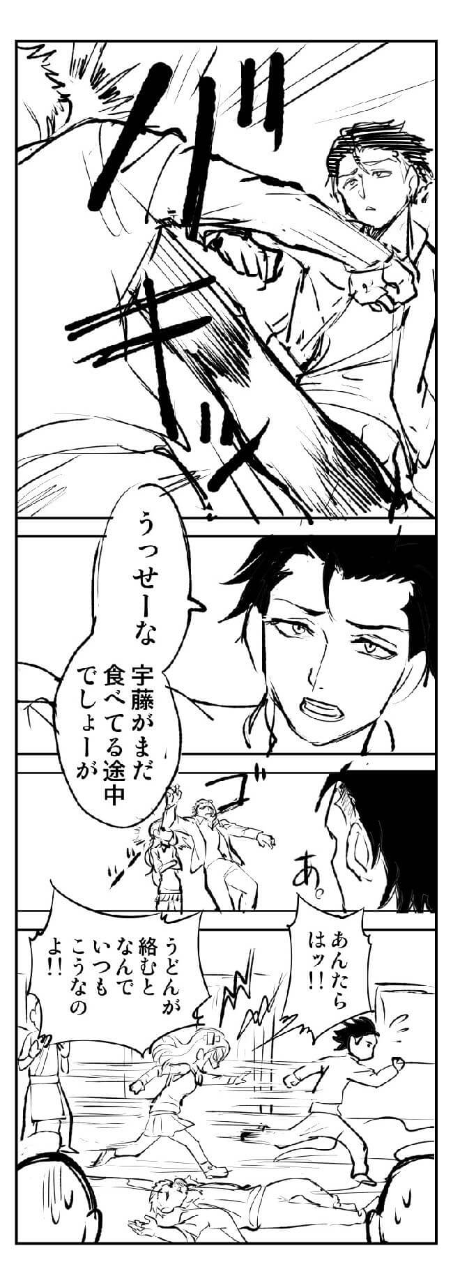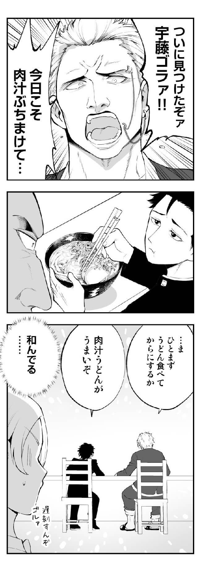 父親のうどん屋を手伝っていたらいつの間にか腕力が強くなり近くの不良高校生から目をつけられることに。